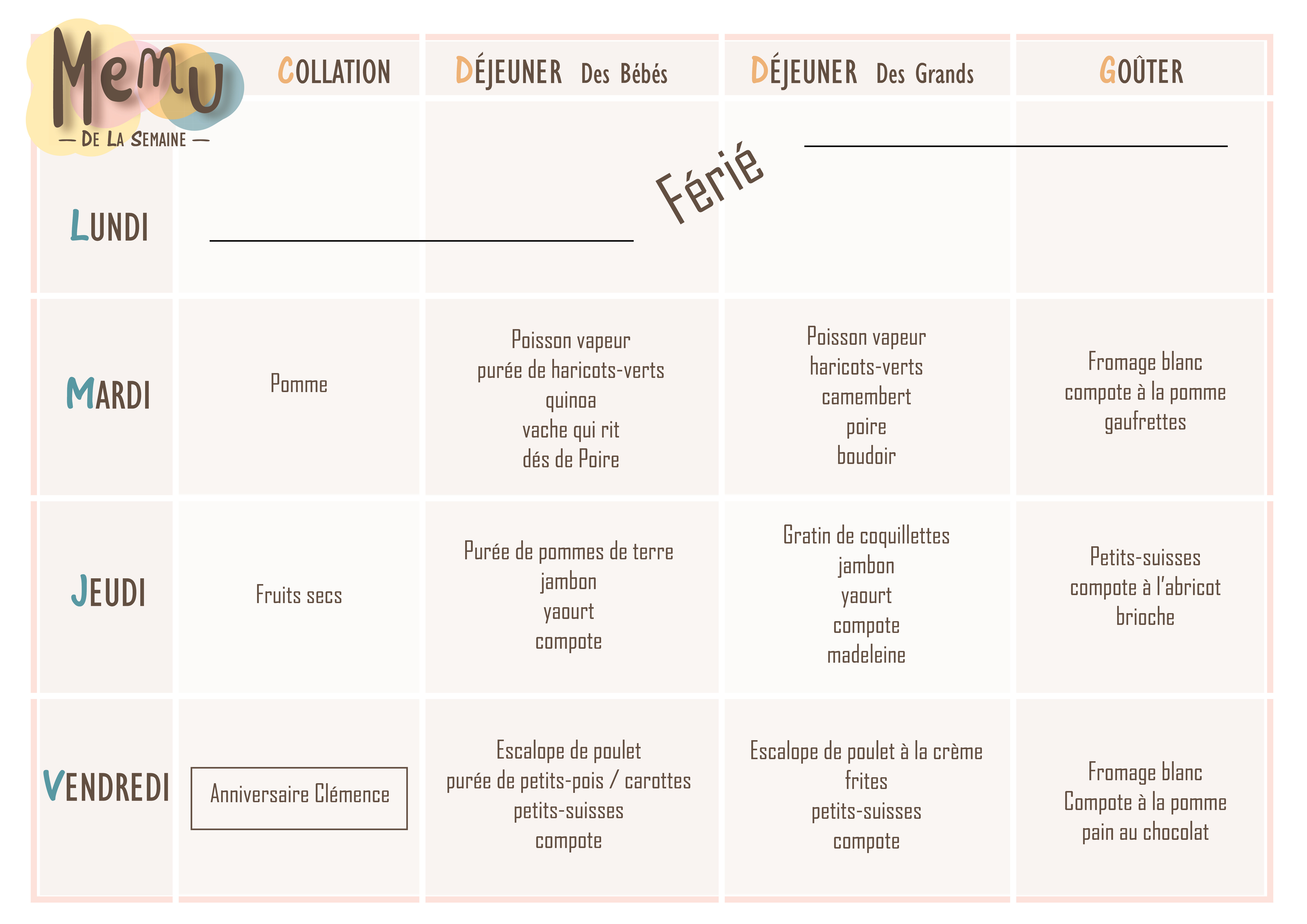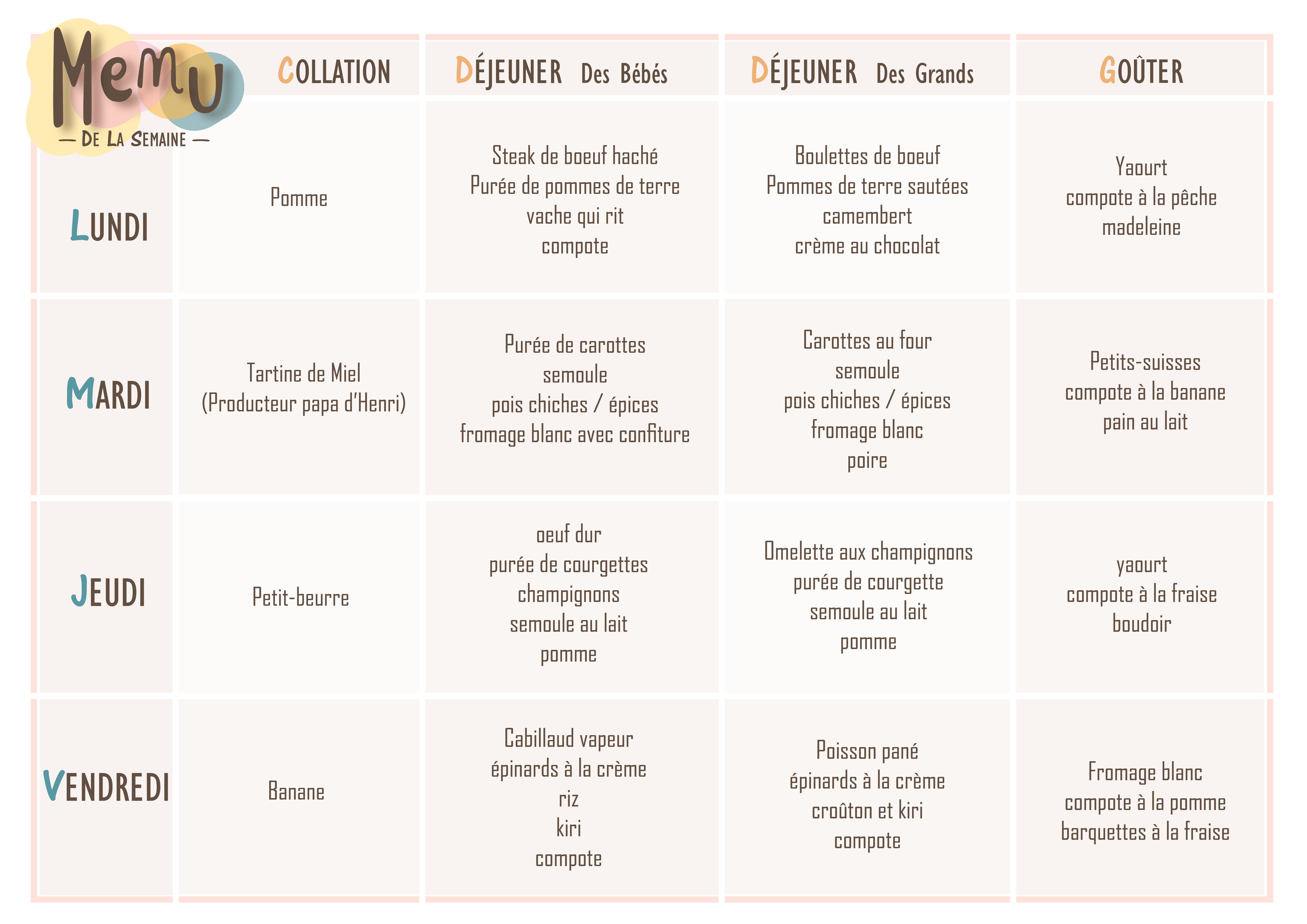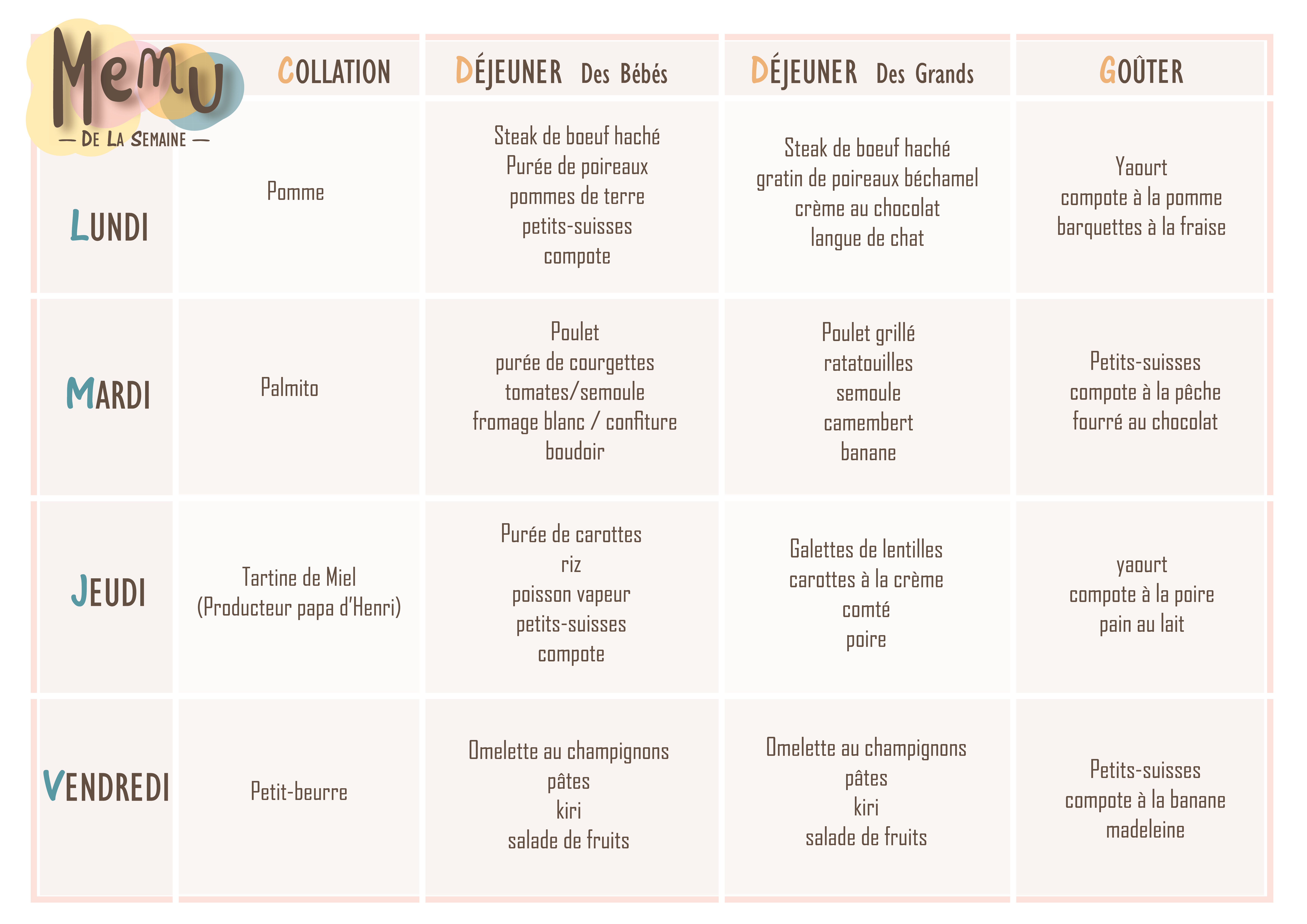 Nous proposons un menu équilibré sur la semaine, composé de produits de saisons frais et de qualité, il est communiqué chaque semaine par mail aux familles.