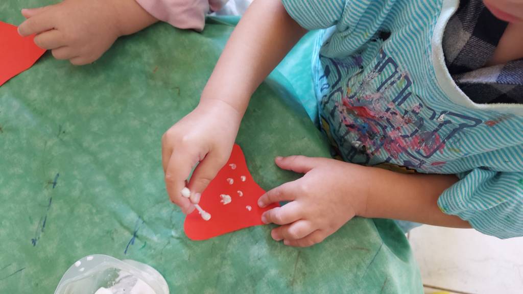 En fonction de l’âge et des envies des enfants, des activités sont organisées par petits groupes (peinture, pâte à modeler,… )